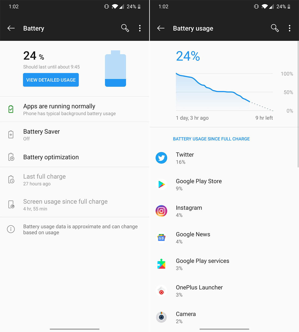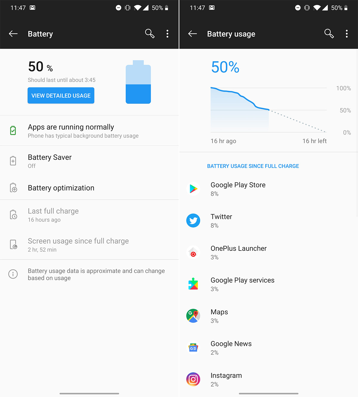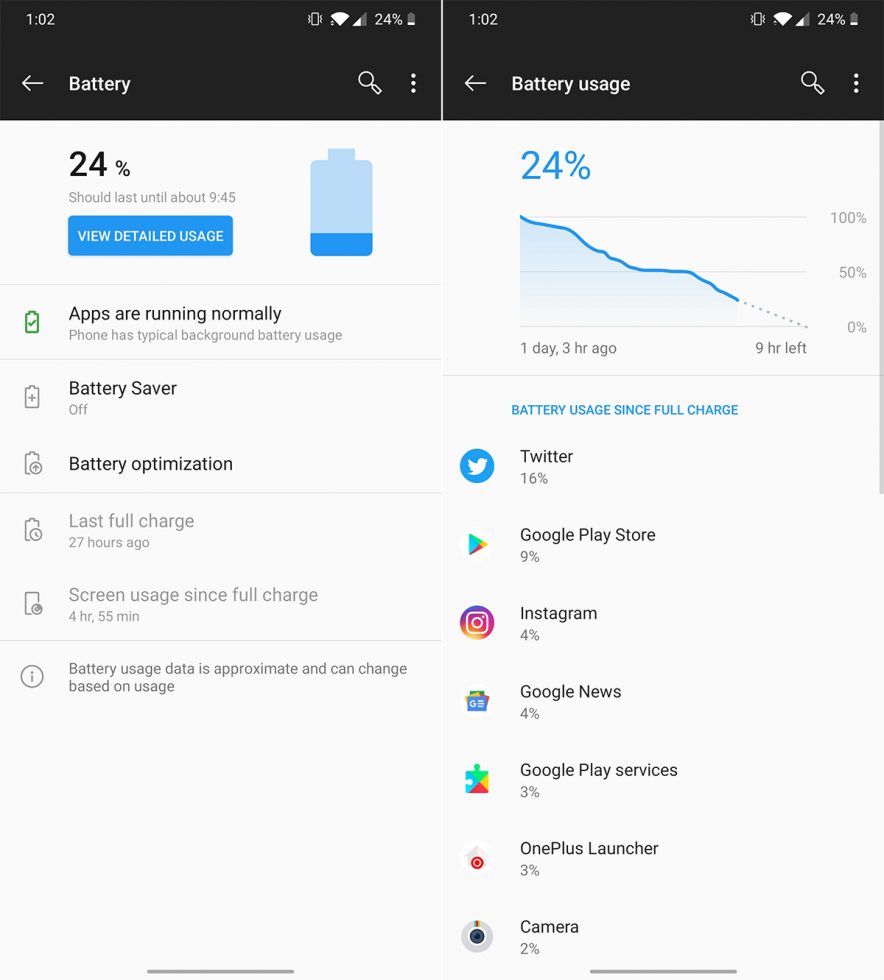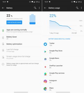 The OnePlus 7T and its 3800mAh battery easily powered me through full days with juice to spare. As you’ll see from the screenshots here, I rarely needed to find a charger within the same day I took the phone off one. For me, most days I went to bed with 30-40% battery remaining, woke up and continued using the phone until I dropped that percentage into the teens and decided it was time to fill up.