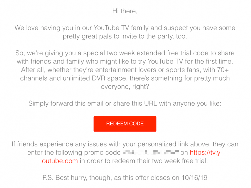 YouTube TV subscribers were given an offer today that lets them share a 2-week free trial of Google’s TV service with friends and family. Through an email that showed up this afternoon, a shareable link and/or code was included that gets your loved ones the goods.
