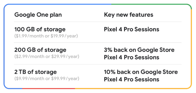 For the rewards program, Google is giving you expanded rewards depending on your tier. For 100GB storage plans, you get access to Pixel 4 Pro Sessions, which really are just 1-on-1 Hangouts sessions with a Google expert for those of you who might need help. For 200GB members, you get the Pro Sessions and 3% back on Google Store purchase. Finally, for 2TB members, you get Pro Sessions and 10% back.