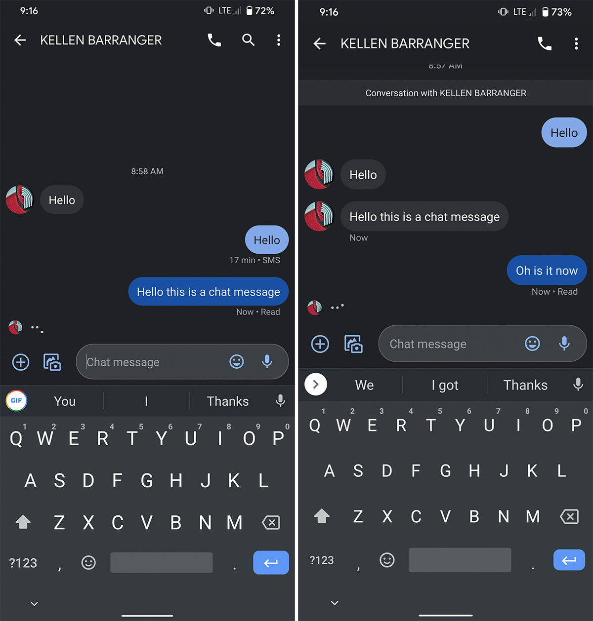 Want proof that it worked? Here’s me texting between Verizon and T-Mobile. You can see in this chat log that my first messages were text and a lighter blue bubble. Once “Chat” kicked on, it switched to a darker blue bubble and the read receipts, as well as the typing indicator went active. I think this works, folks.