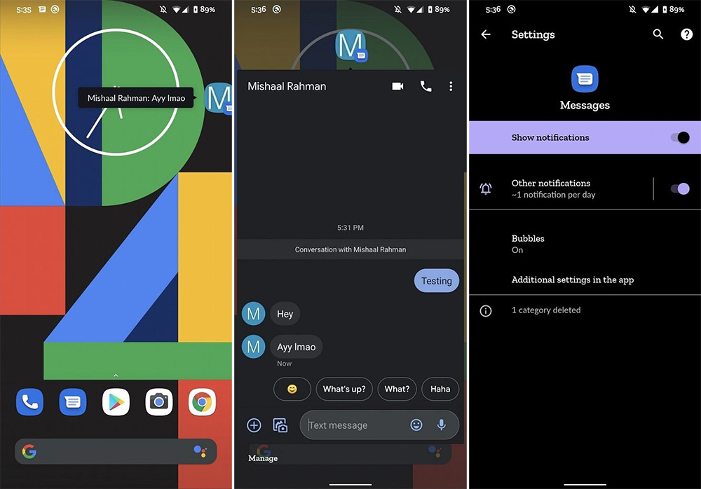 In the Google Messages app, XDA found a way to enable Bubbles on what appears to be a Pixel phone running Android 10. As you can see in the screenshots here, we do indeed have toggles for Bubbles that are specific to the Messages app as well as the pop-up windows we expect to be a part of the Bubbles experience.