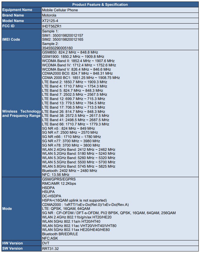 In the FCC docs, again, we know that this device falls under XT2125, has LTE support on Verizon, AT&T, and T-Mobile, as well as sub-6 5G on AT&T. We can also see WiFi 6 here, which sort of suggests a nicer chipset than we might get from a typical Moto G device. We couldn’t find evidence that this is indeed the Snapdragon 800 series, though.