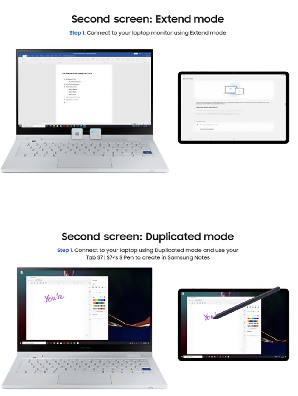 Galaxy Tab S7 owners can now use their tablet as a Second Screen with Windows 10 devices in a couple of modes. They can use “Extend Mode” to essentially add the Tab S7 or S7+ as a secondary monitor or they can have it duplicate their PC actions in “Duplicated Mode.” This is all wirelessly done by the way.