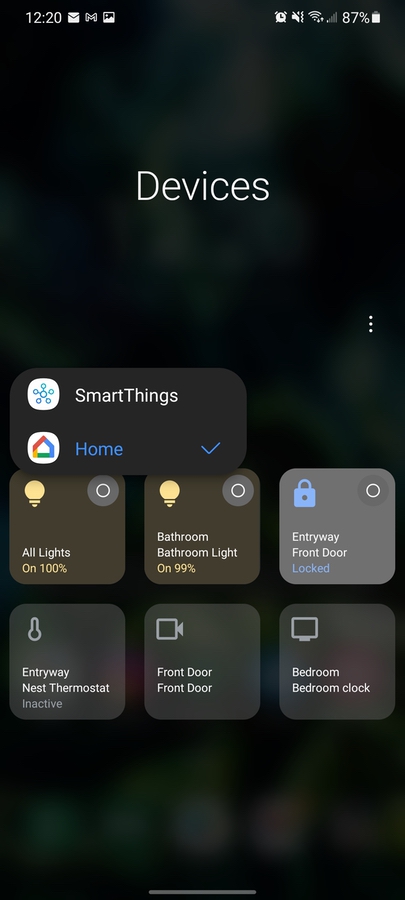 You see, like I mentioned, these device controls are typically accessible via the power menu on Android 11 devices. However, in One UI 3.1, the controls are placed in the Devices and Media menu that is incorporated into the notification pulldown. Furthermore, your Home devices are also placed in a drop down menu below Samsung’s own SmartThings controls, so it’d take a bit of accidental stumbling for anyone to come across this stuff unless they knew exactly what they were looking for.