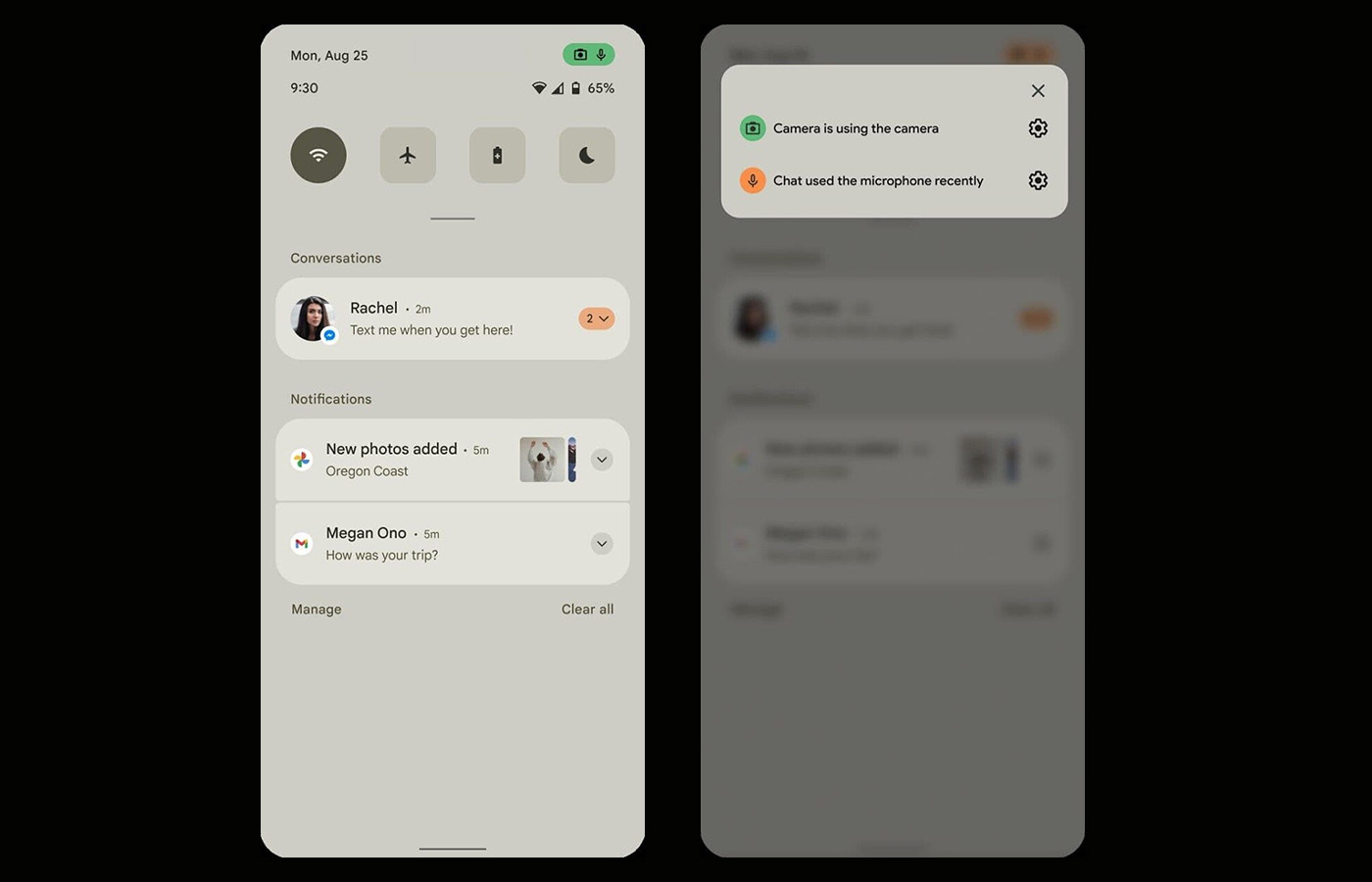 The other thing to note here is that green icon that is showing both camera and microphone in the top right corner. It sure looks like a privacy area that will highlight apps that have recently used those two permissions. You would be notified of that usage and then allowed to quickly change those settings if you’d rather those apps not do that.