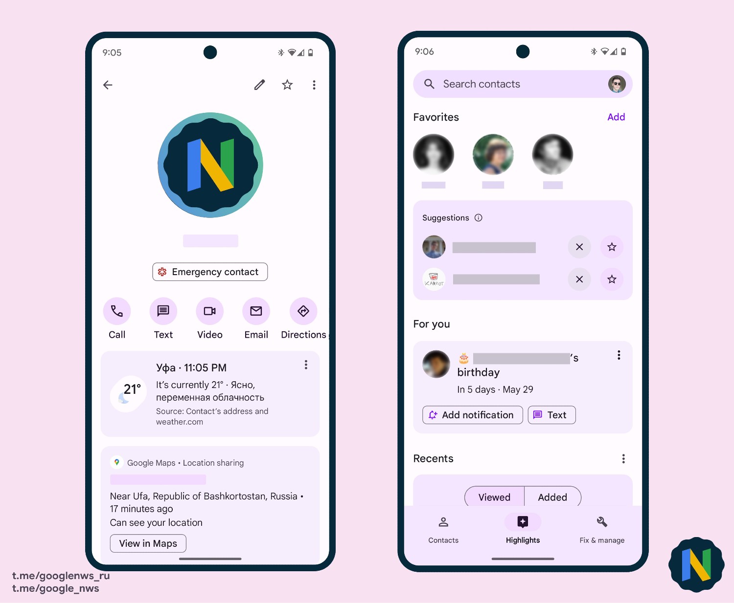 Shown in screenshots courtesy of @Nail_Sadykov, the upgraded app has new buttons that align with changes we’ve seen across Android already, but more importantly, it is detailed that should you add in a contact’s address, weather for that address can be pulled in, along with the local time.