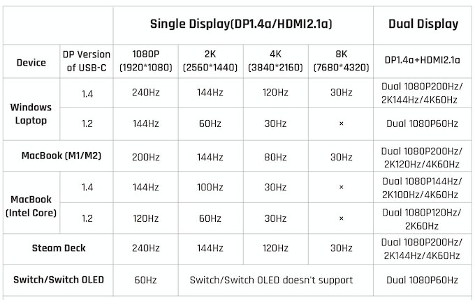For the multi-monitor setups, this dongle offers a great use in that it supports a variety of different scenarios. You could have a single 8K monitor running at 30Hz or up to two 4K monitors going at 60Hz and a lot in between. A few scenarios are listed above.