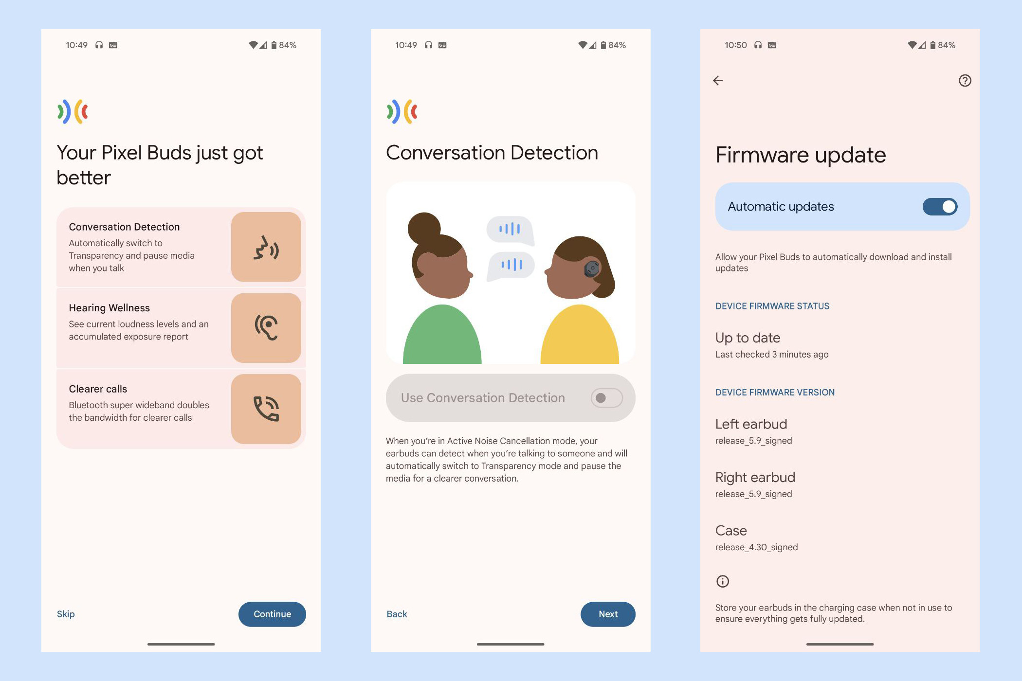 We have an entire write-up on everything new from last week, but there are 3 items Google highlights after the update installs. They want you to know about Conversation Detection, which is a new mode that will automatically switch your buds to Transparency mode and pause your media to allow for the conversation. Hearing Wellness is another spotlighted feature that keeps track of your loudness levels to let you know if you should give you ears a volume reduction break at some point. They also want you to know about Clear Calling, a feature from Pixel phones that is now in the Buds Pro. Clear Calling attempts to clean-up audio to the person on the other end of your calls if they are in a loud environment.