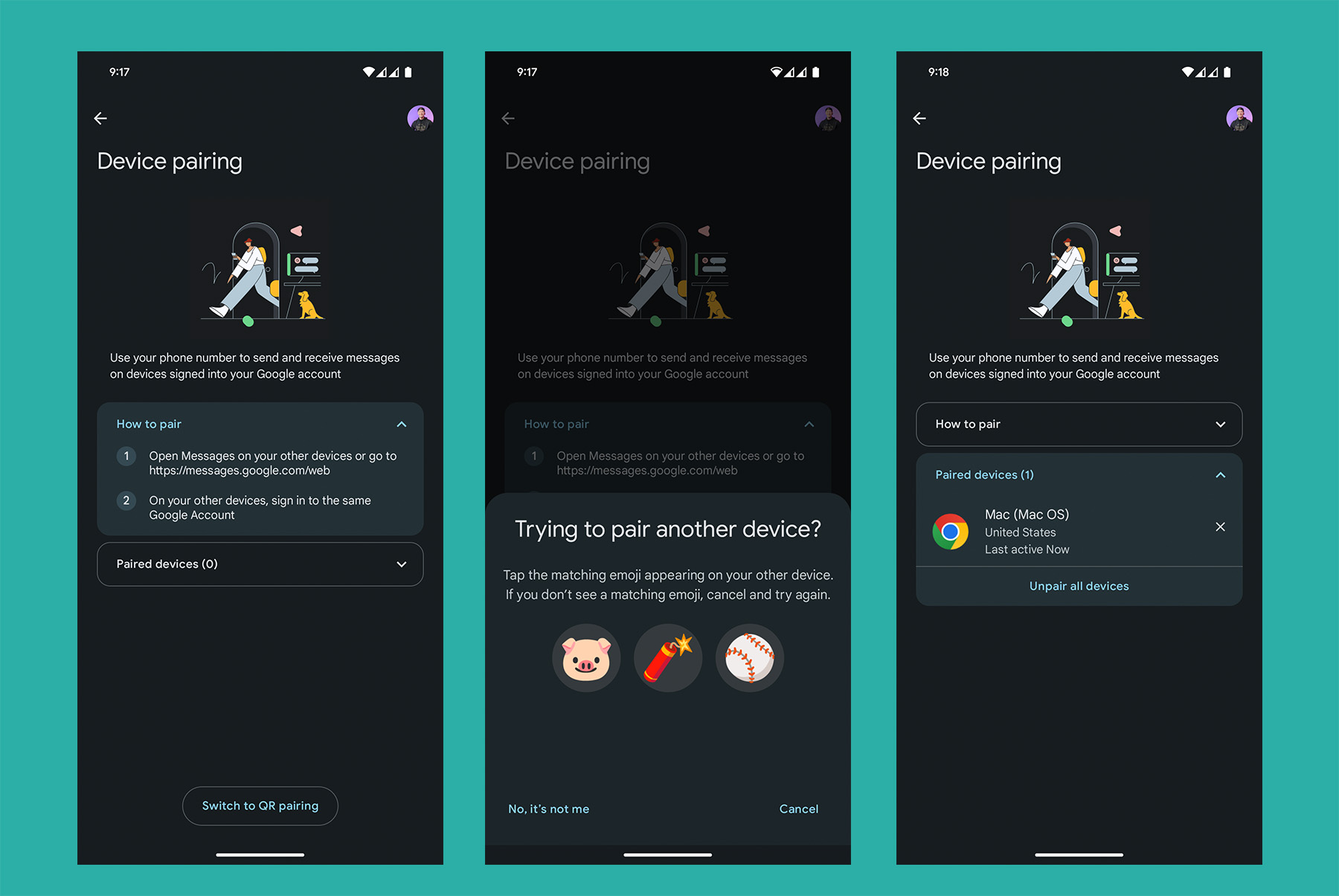 Previously, a user would head to messages.google.com and see a QR code which they would then snap a photo of inside the Messages app using their smartphone. It was fine, but now, the management of accounts between your phone and the web is powered Google Accounts. Instead of a QR code, you’ll match an emoji between the web and smartphone. Once paired, you’ll see a lovely UI for your paired devices.