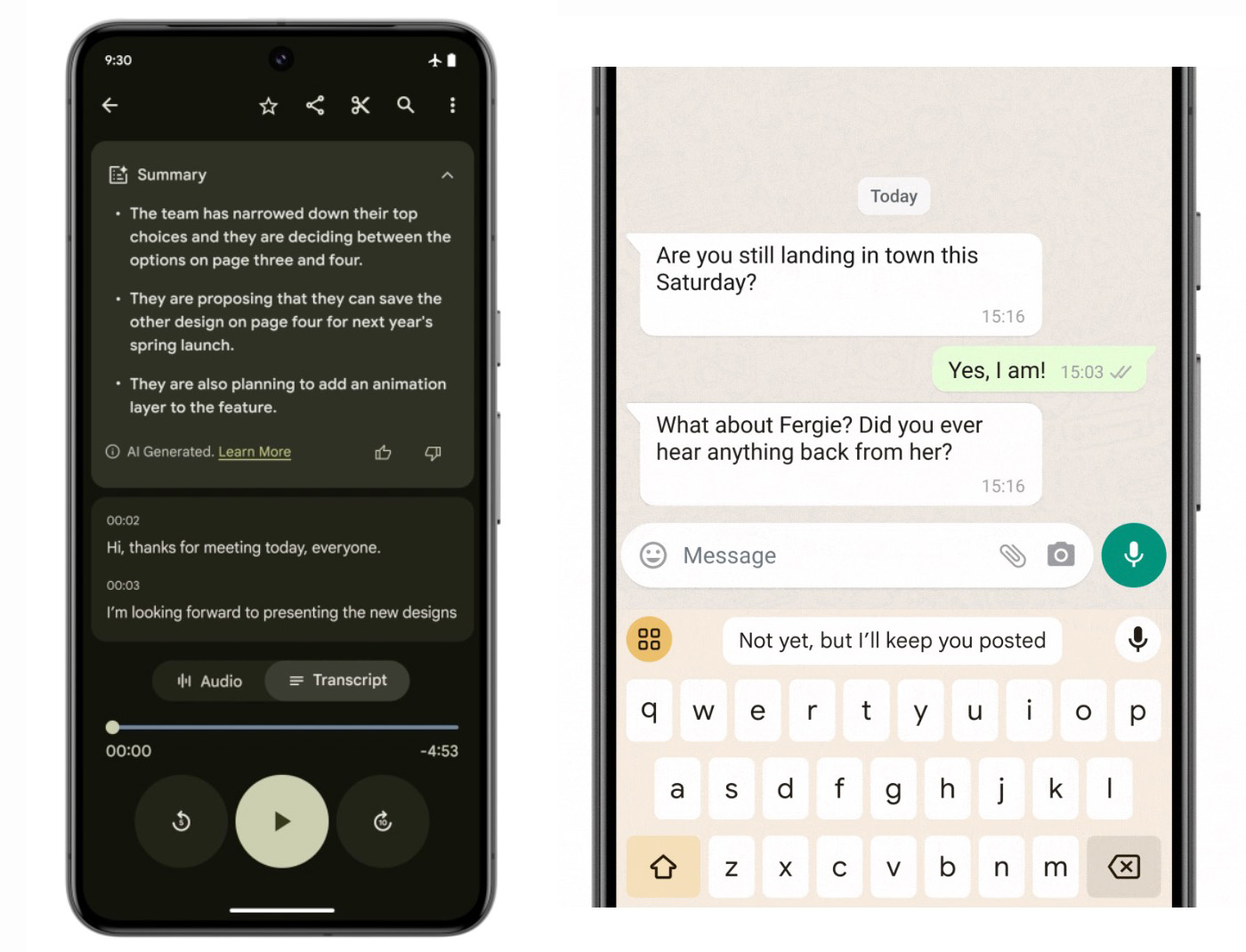- Summarize in Recorder. This feature uses Google’s Recorder app to summarize recorded conversations you have and doesn’t require a network connection to do so, because again, this is happening on-device with Gemini Nano.