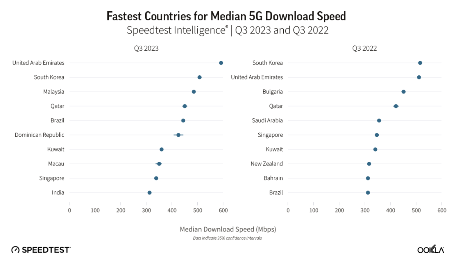 The top 10 is impressive, with the fastest country being United Arab Emirates with a blazing median 5G speed of 592.01 Mbps. Right behind them is South Korea with 507.59 Mbps. The slowest of the top 10? That would be India at just above 300Mbps, which is still incredibly fast. Heck, even Kuwait is around 375Mbps, good enough for 7th place.