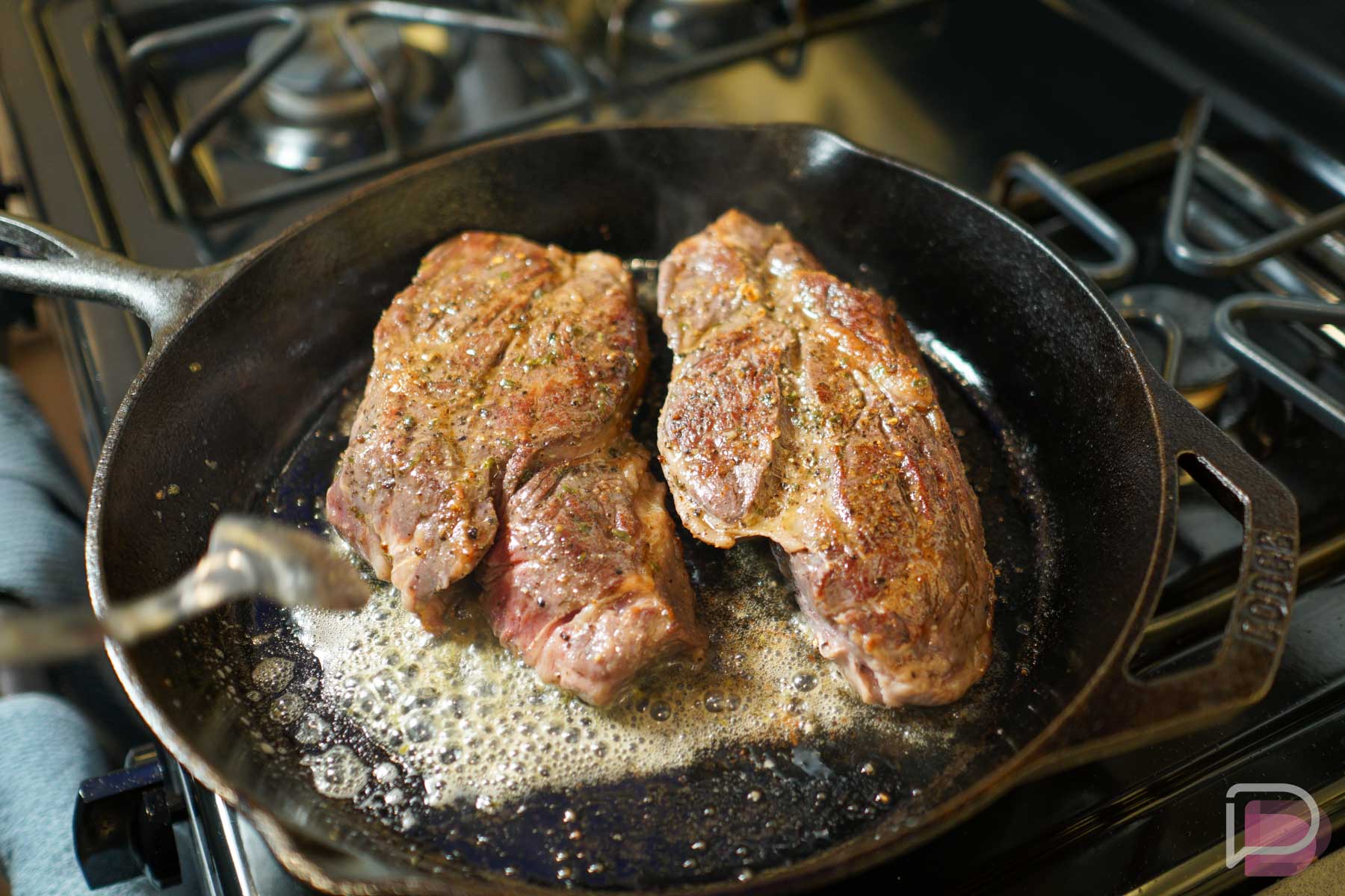 Sous Vide Station is my first personal experience using this cooking technique, and before this, I was pretty intimidated. What impresses me so much is how easy it is to set up and use. In the most simple of explanations, you fill up the tank with water, program what you’re cooking into the gorgeous full color touchscreen, throw your food into a plastic bag, suck the air from the bag with the unit’s own tiny vacuum, and then hit start. The unit manages your water temperatures, notifies you when your food is done, and unlike many less expensive sous vide options, it heats the large amount of water needed for cooking extremely fast. For a ribeye steak about 1-inch thick, the water cooking takes about one hour. Once out of the water, give it a quick sear on the stovetop while basting in butter and herbs, and you have yourself an insane flavor experience.