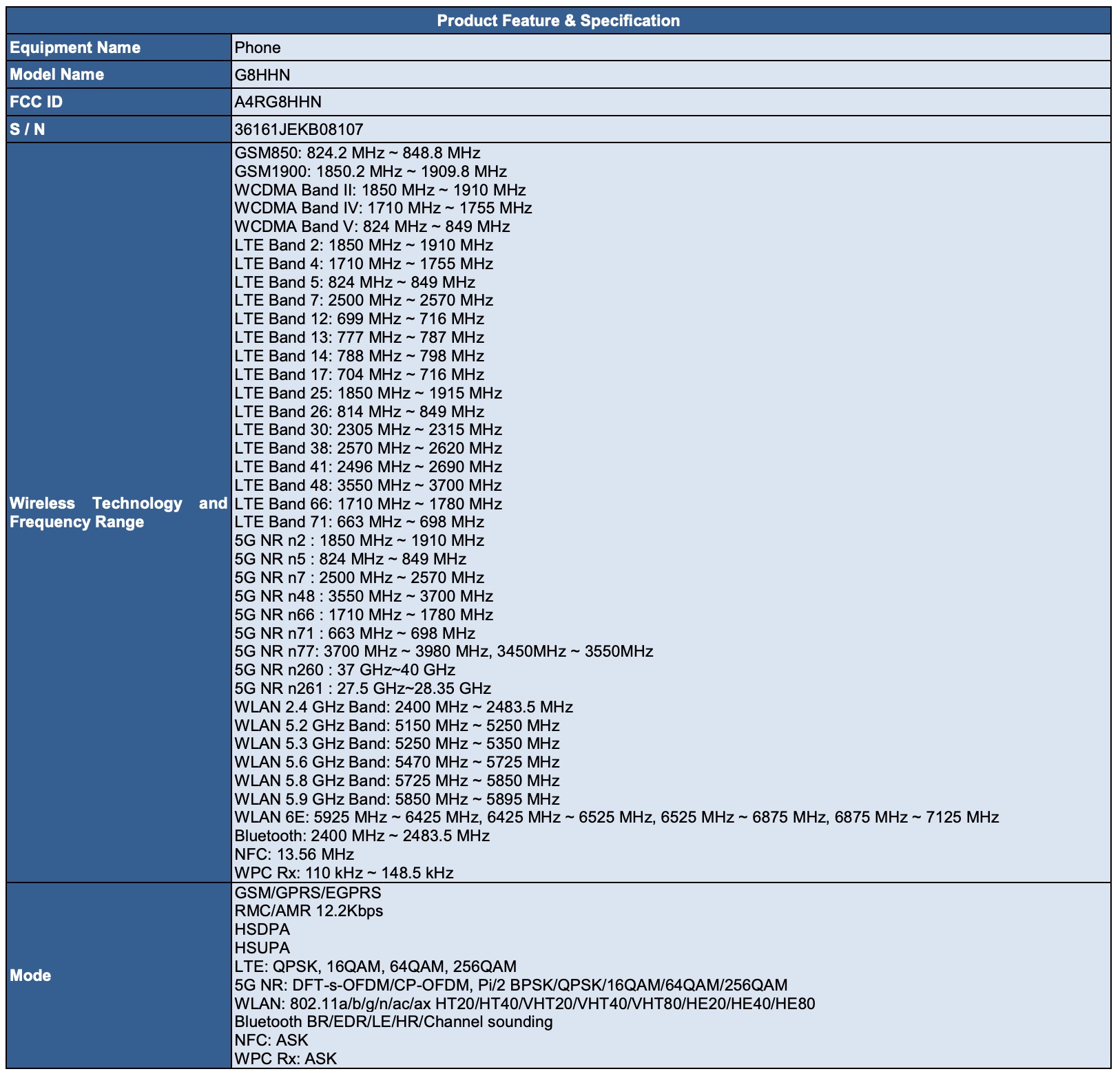 A device using model number G8HNN has undergone testing, and thanks to that testing, we can confirm at least a few things. The device will likely support wireless charging, offer WiFi 6E, NFC, features all of the necessary 5G radios to make it work properly on all carriers in the US, and it also appears to include mmW support.