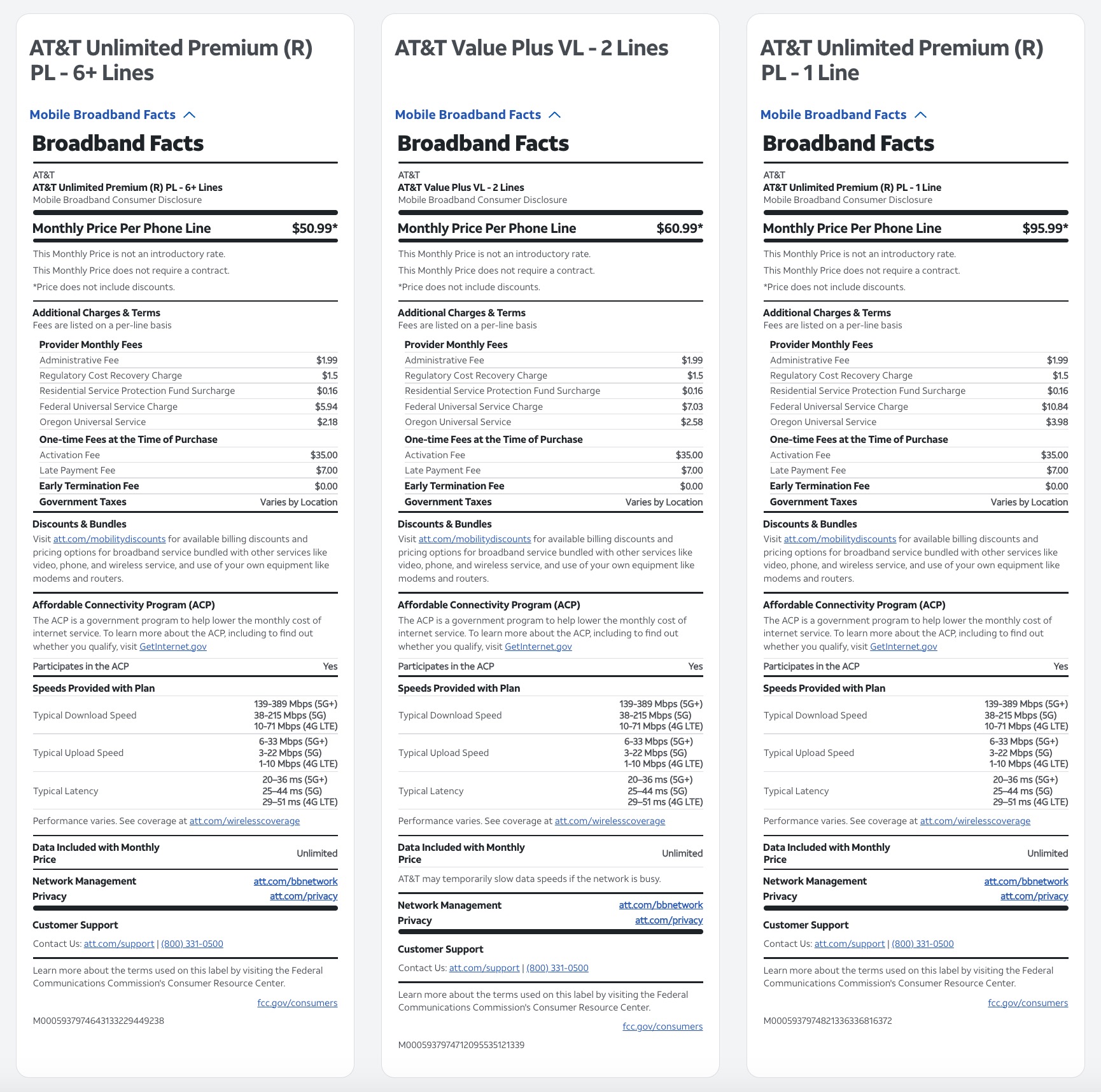 AT&T’s Broadband Facts for wireless and wireline plans can be found here.