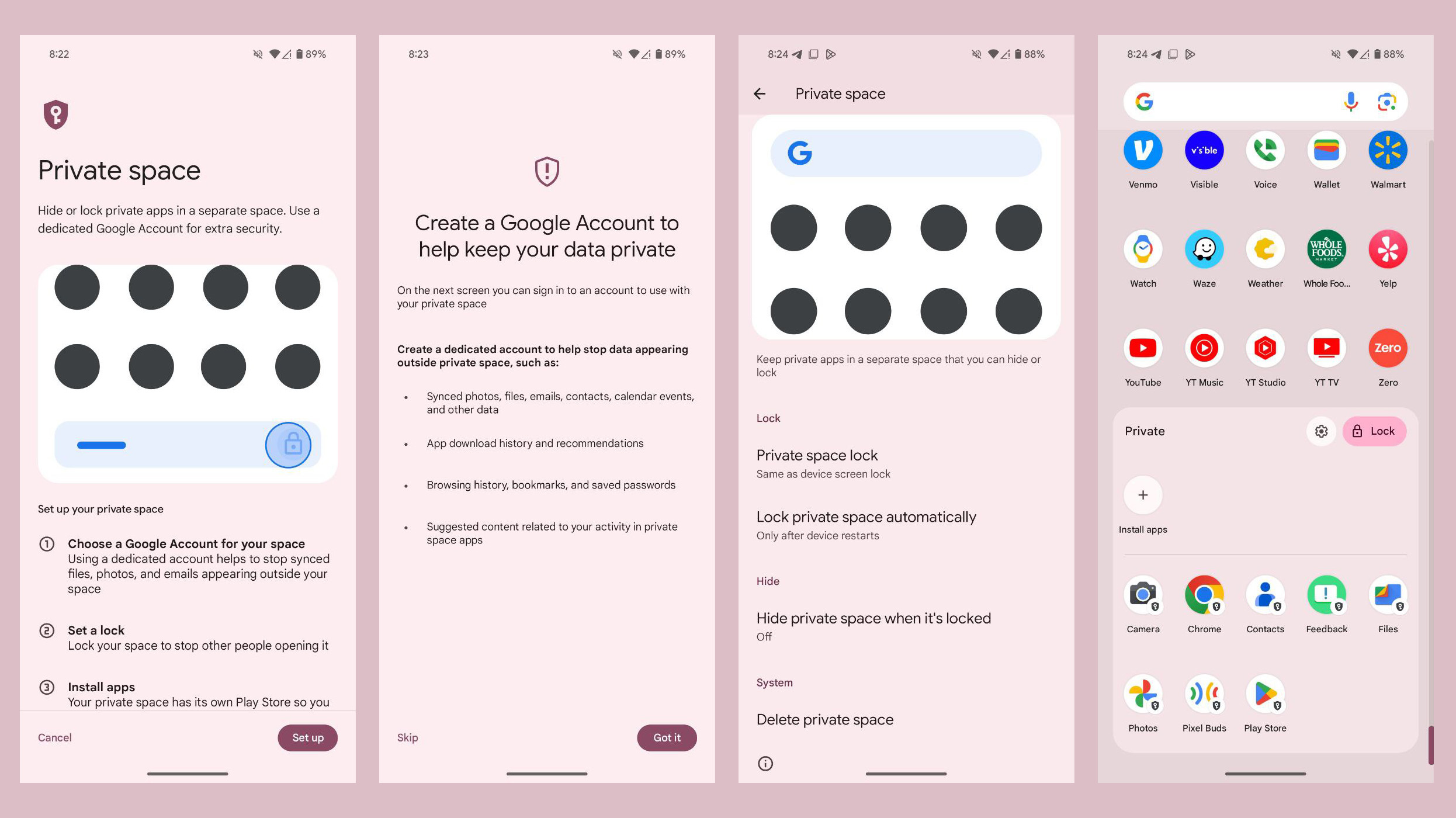 Once created (you can get started without a new account, but it’ll eventually ask you for one), Private Space lives at the bottom of your app drawer in an area that can be locked or left unlocked. It lists apps available, plus you can install new ones just to this space. Again, you’ll need a separate account to really be able to use this, so keep that in mind. Finally, you can delete the space if you need to.