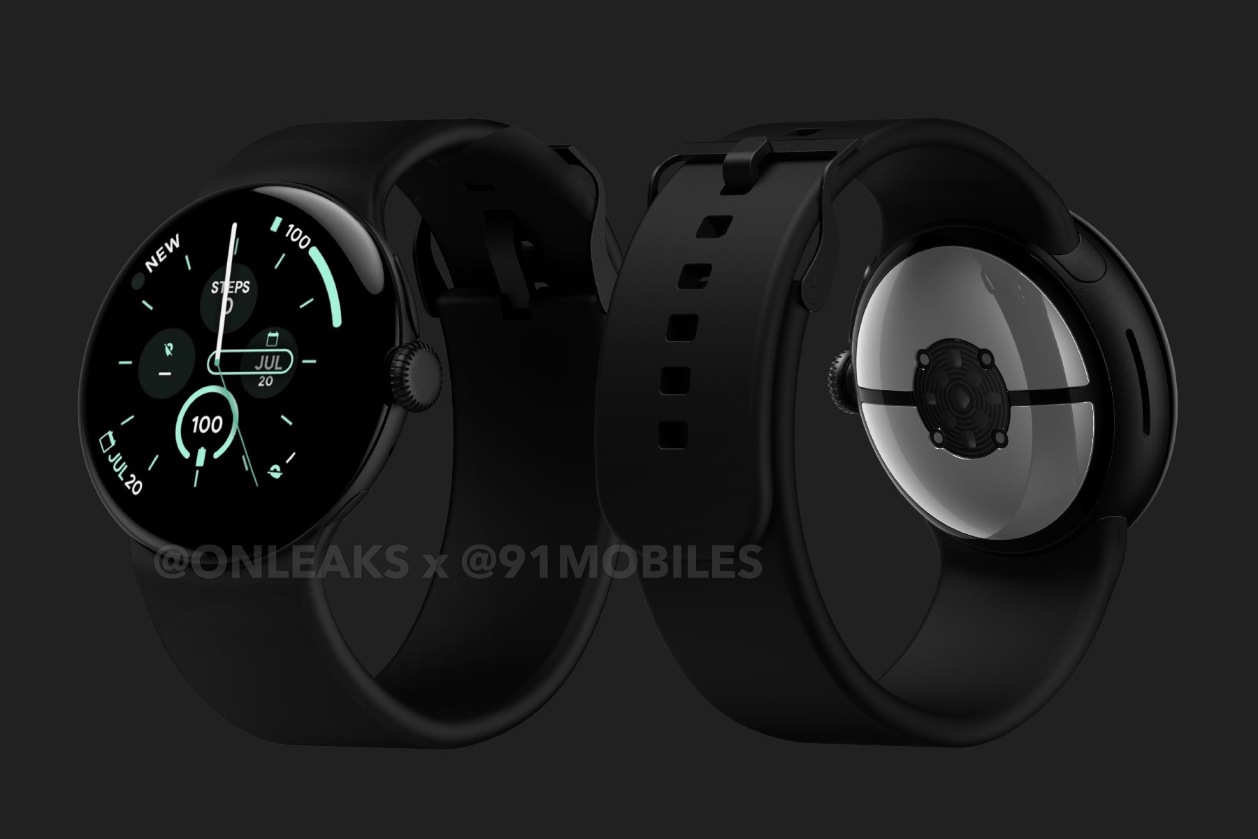 The renders provided showcase the black on black model, a staple for the Pixel Watch lineup. The backside shows the array of tracking sensors, side speaker, and Google’s continued usage of its proprietary band system. Thankfully, it doesn’t appear that Google intends to switch up the backside year-over-year, meaning our Pixel Watch 2 chargers should work just fine.