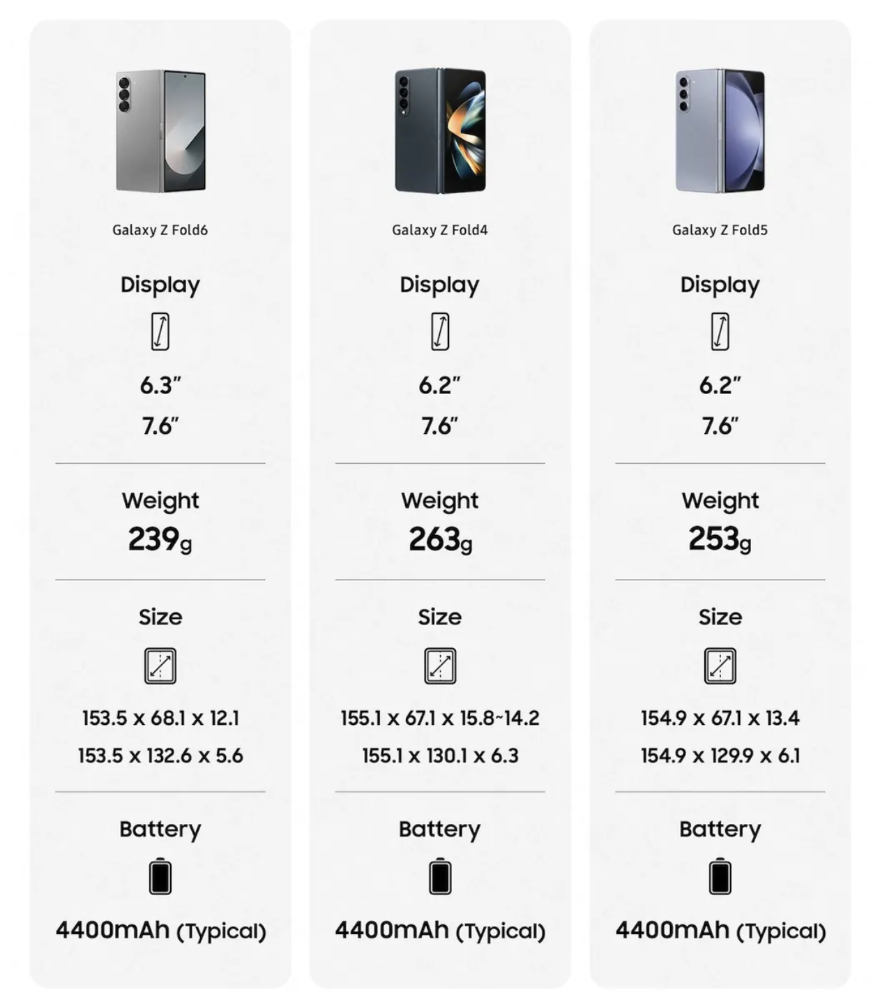 According to the product pages, the Galaxy Z Fold 6 has slightly larger front display of 6.3-inches, while the main measures in at 7.6-inches. Peak brightness has increased to 2,600 nits. The overall weight is considerably lighter, with the battery size unchanged from last year. The Flex Hinge system appears to have received a good upgrade this year for both devices, with a more flush look getting achieved when open and more compact design when closed.