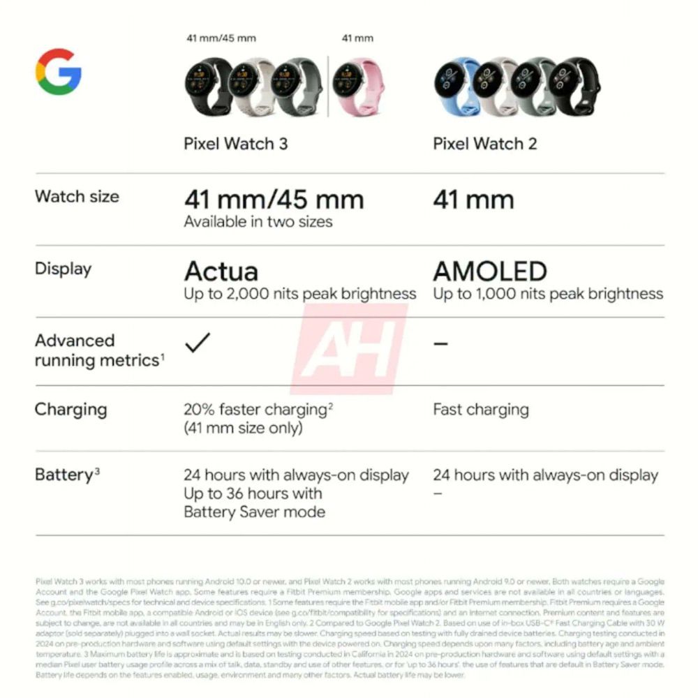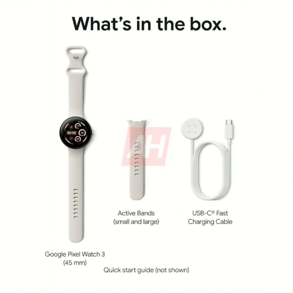 According to the material, Pixel Watch 3 (41mm) will offer charging speeds of up to 20% faster, and both sizes will have 24-hour battery life with Always On display activated, plus 36-hour battery life when in Battery Saver mode. In the box, expect the watch, a charging cable, plus size small and large bands. Pixel Watch 3 (45mm) will offer 40% more screen space, great for viewing incoming notifications, scrolling through apps, and tracking your fitness data.