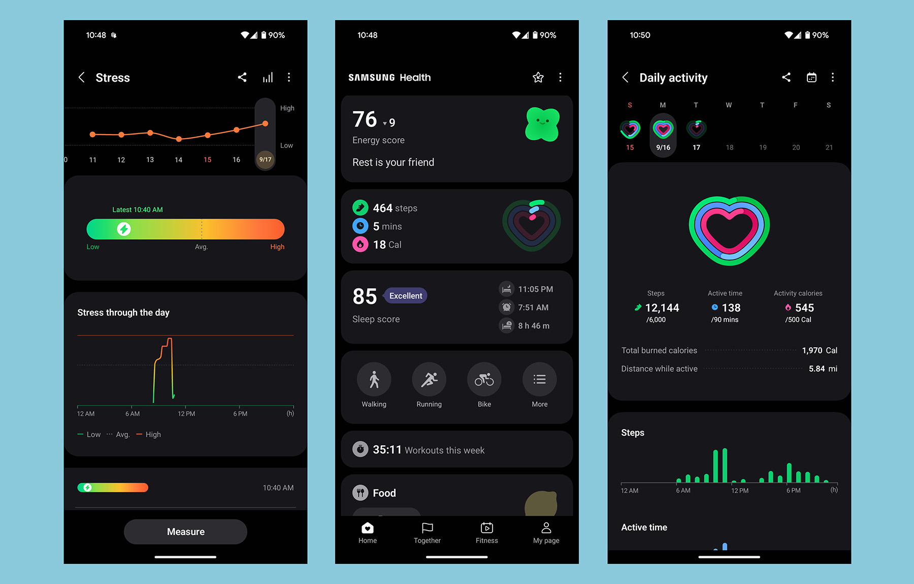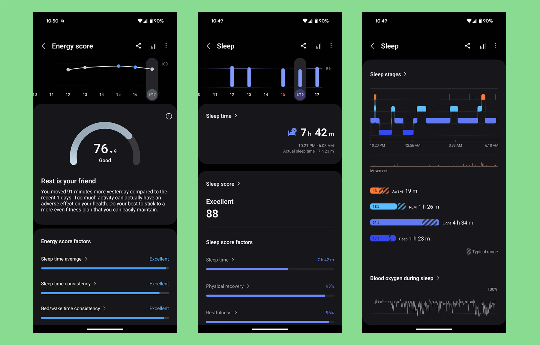 How accurate are these scores, anyway? I would say relatively. Both the energy and sleep scores seem pretty good about delivering an accurate numerical representation of how I feel, but it’s not always accurate. I believe my general level of stress has been higher lately, so I’m sure that has been affecting both my sleep and energy, essentially throwing off my baseline levels. For example, I woke up feeling pretty good today, though, Galaxy Ring gave me an energy score of just 76. Jokes on you, Galaxy Ring, I have softball tonight so rest and recovery won’t be happening.