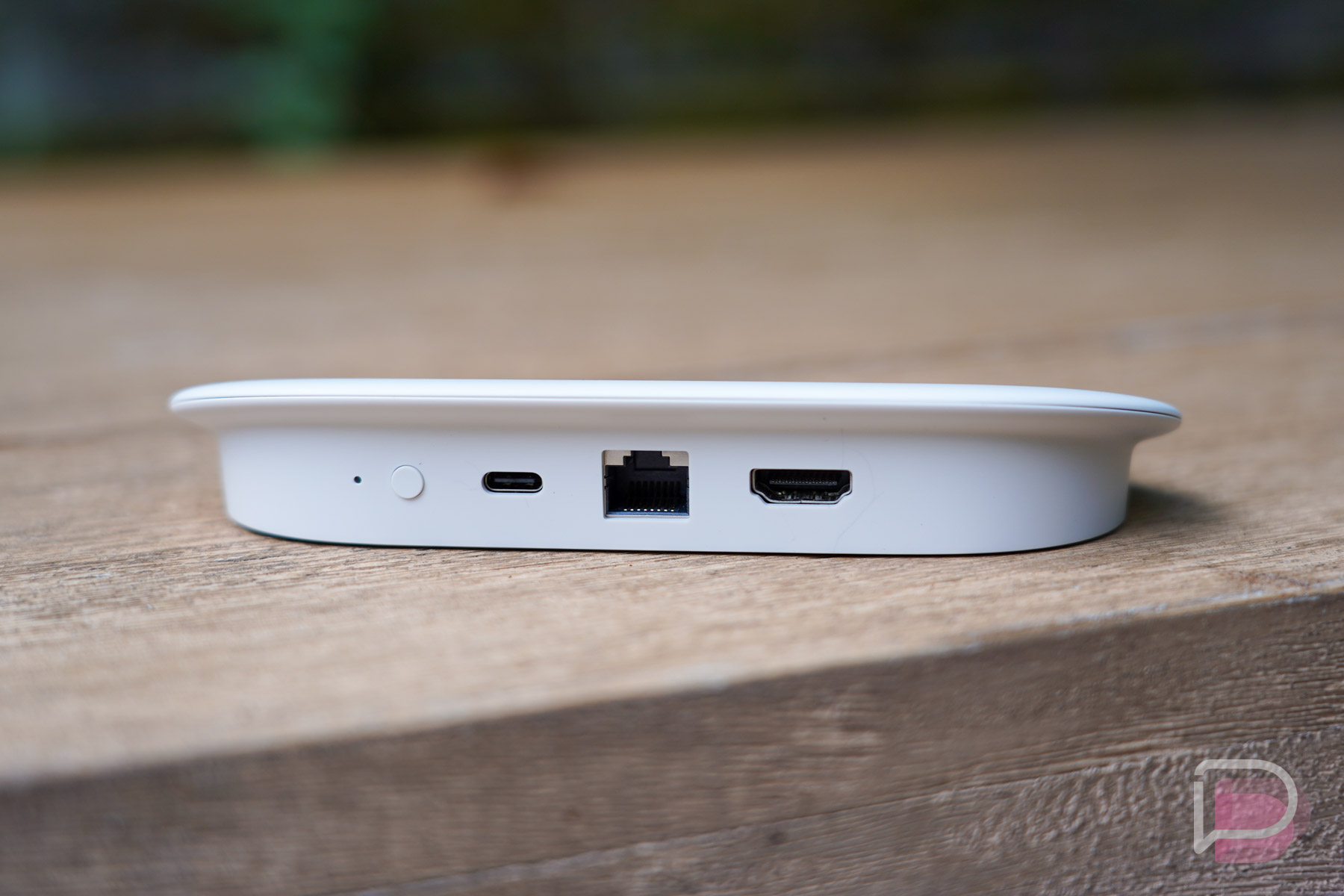 The design isn’t offensive or anything. It’s like an oblong puck with a triangular lift on the bottom and clean exterior that comes in either Hazel or Porcelain. It requires USB-C power and HDMI, so there are going to be at least two cables coming out of the back that you’ll need to do something with. There’s a network port too if that’s your thing.