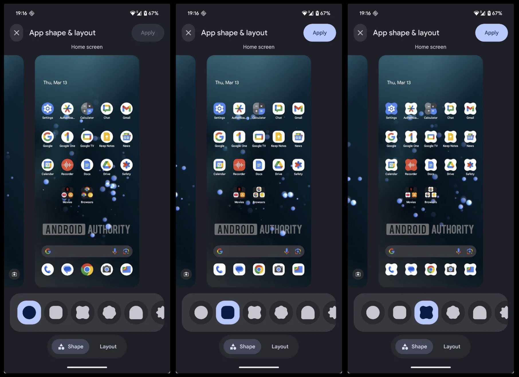 An updated Home screen customizer is shown below with “Shape” and “Layout” sections. The “Shape” section is where the new icon shapes currently live, and there are apparently 6 of them that are referred to as “circle,” “square,” “four-sided cookie,” “seven-sided cookie,” “arch,” and “complex clover.”