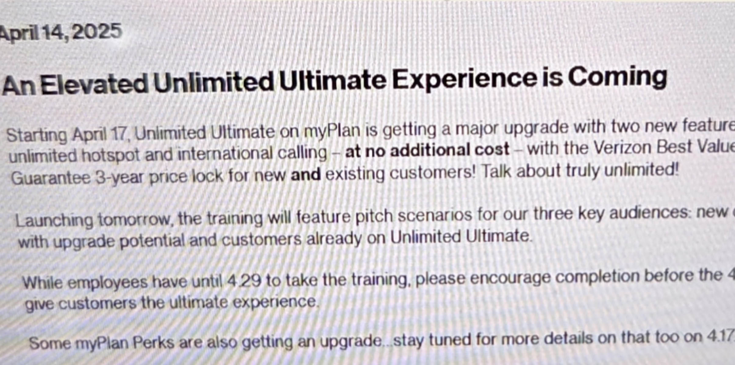 The biggest piece of this report comes from Sneed Mobile Tech, who received training information from a Verizon source and provided a screenshot of the news. The training intro suggests that April 17 (tomorrow) will bring two new changes to Unlimited Ultimate. Those changes are unlimited hotspot and international calling.