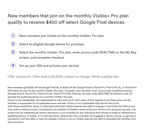 How does this Pixel 9 Pro deal work? It’s pretty simple because Visible keeps things simple. You have to be a new customer who signs up for the Visible+ Pro plan, which costs $45 per month. As a part of signing-up for that plan, you add whichever Pixel 9 series phone to the cart that you want, then apply coupon code “DEALTIME” and see the cash just wash off the final price.