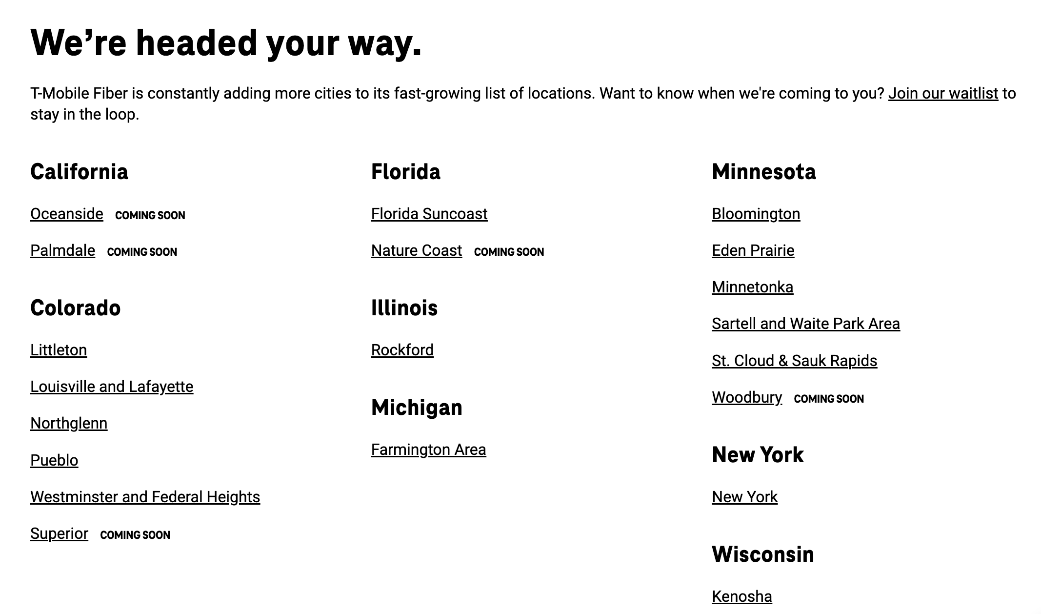 At launch, T-Mobile says Fiber will cover 500,000 households in the US, ranging from places like Rockford, IL to Pueblo, CO. A full list of available markets can be viewed here, but to put it plainly, it’s more than likely not available in your town at this moment. T-Mobile intends to grow the service, so feel free to add yourself to the waitlist. The company says that it expects to reach 12 to 15 million households or more by the end of 2030.