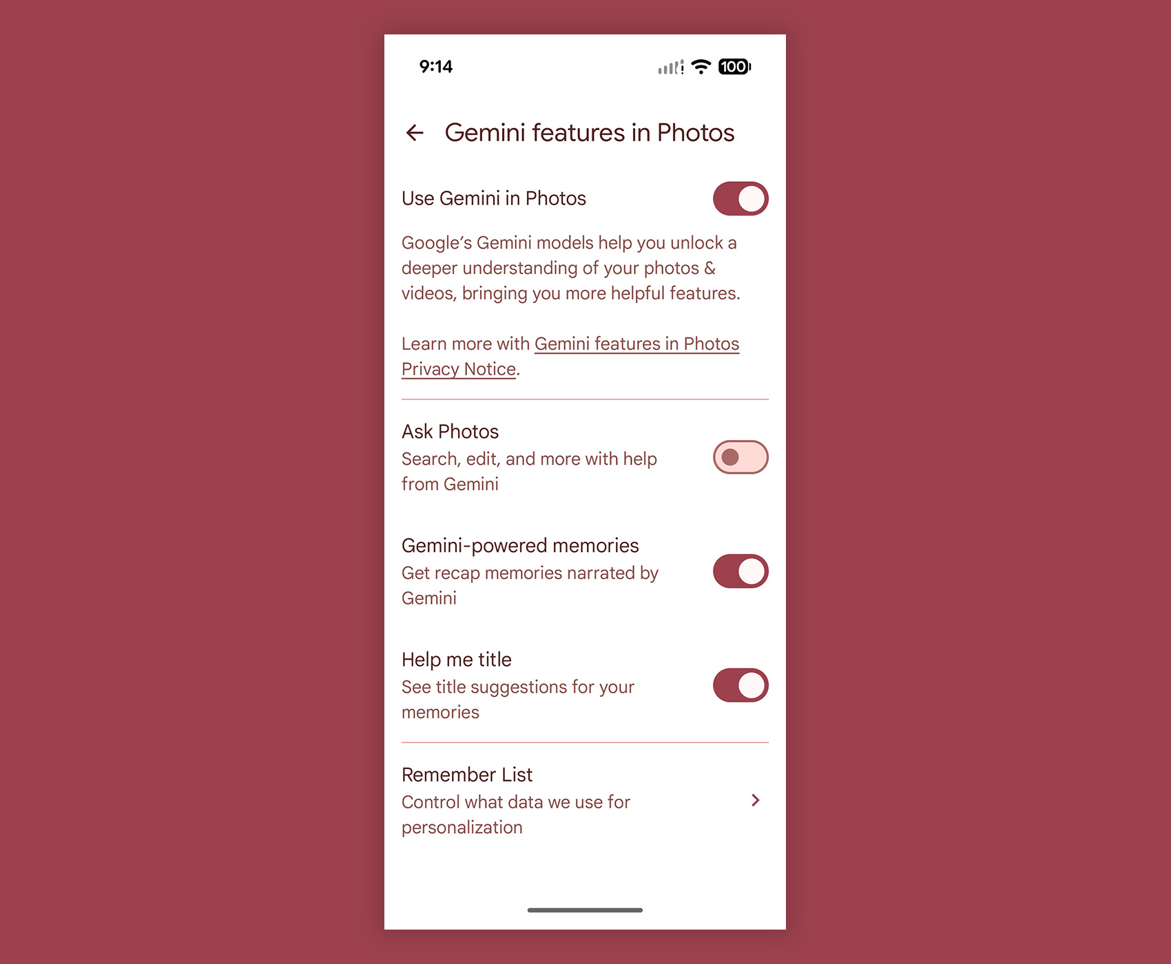 - Toggle the “Ask Photos” option off