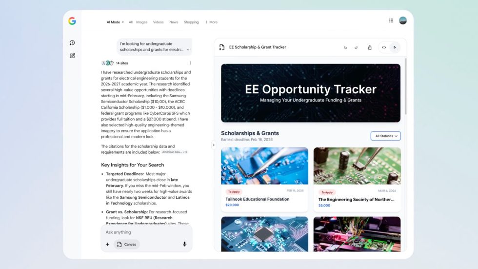 While availability has been widened, Google also introduced new features, such as support for creative writing and coding tasks. Google provides a pretty wonderful example of how to utilize Canvas, tasking it with creating, “a dashboard to visualize and track information on academic scholarships, including all the different requirements, deadlines and dollar amounts.”